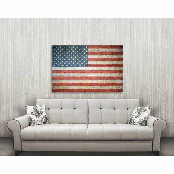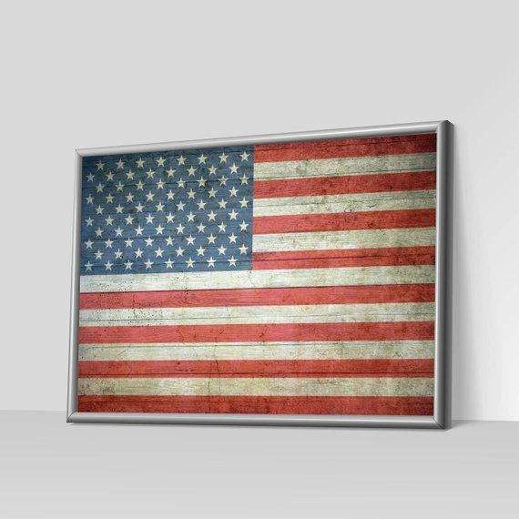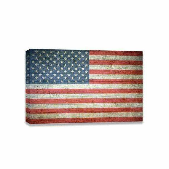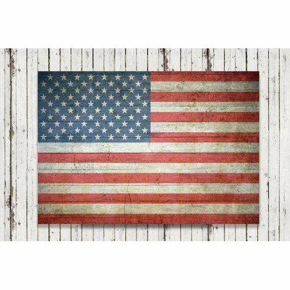 This print features a distressed/antiqued American flag on your choice of paper or canvas. The background has a wood overlay, but please note it is NOT real wood. This is not a wood pallet artwork. This beautiful American flag is printed on paper or canvas.
