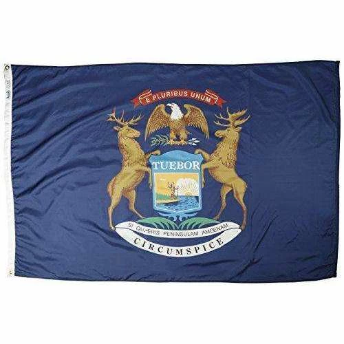 Michigan’s third and current Flag was adopted in 1911. It consists of the state seal on a blue field. In the seal, a moose and elk support a shield with a picture of man waving on the shores of Lake Michigan with a sun rising behind him. Inscriptions in Latin translate into ,If you are seeking a pleasant peninsula, look around you, I will defend, and the most famous Latin quote in the United States ,E Pluribus Unum, meaning ,From one, many. All Annin Flagmakers flags are sewn in either South Boston, VA or Coshocton, OH. Annin’s superior quality is time-tested and meets the requirements of the most discerning buyer.