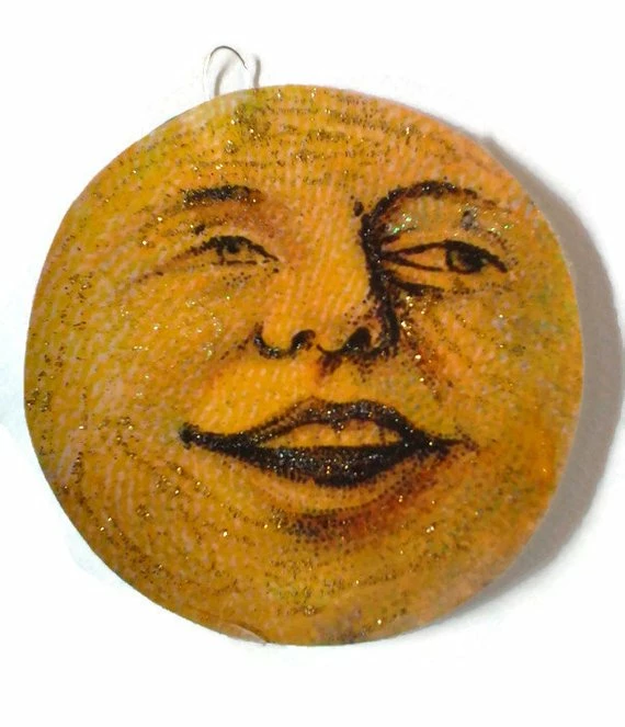 Halloween Ornament Decoration Laughing Smiling Spooky Moon, vintage Halloween posctard.