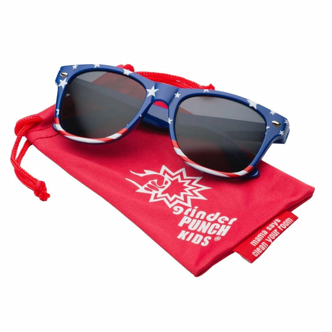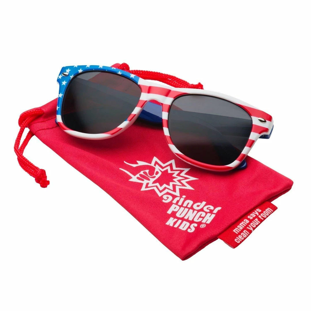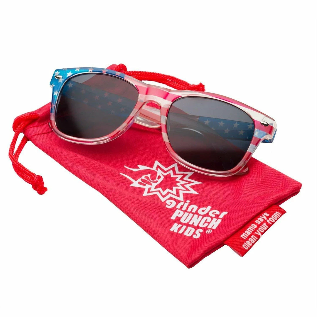 grinderPUNCH Kid’s Wayfarer Inspired American Flag Sunglasses have UV400 Protection from UVA and UVB rays. Includes a grinderPUNCH microfiber cleaning pouch. Great for children ages 3 – 10 years old. These cute American flag sunglasses are perfect for boys and girls. Get them and see your children smile!