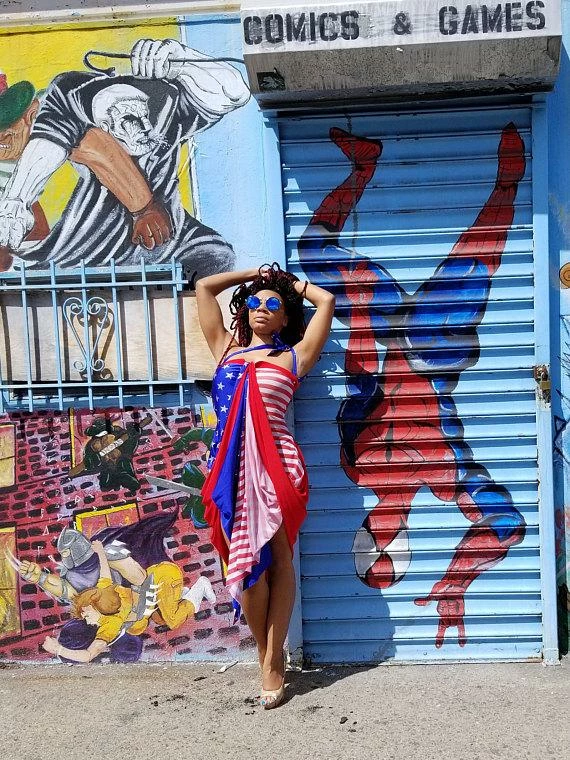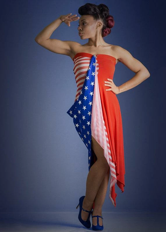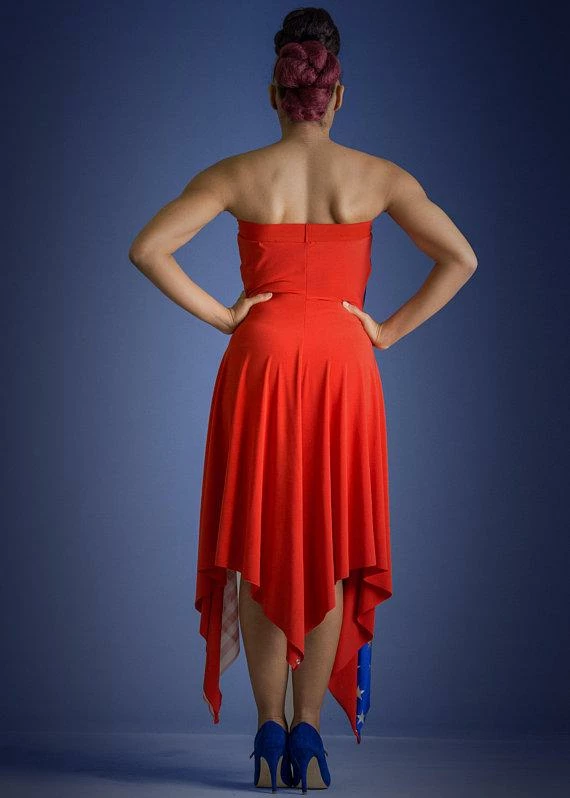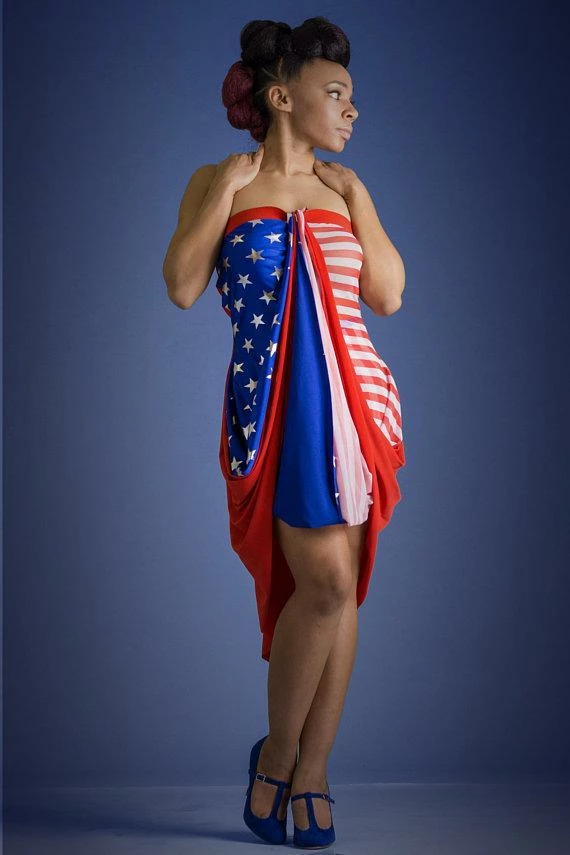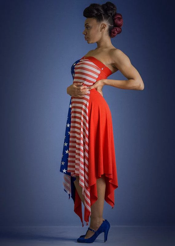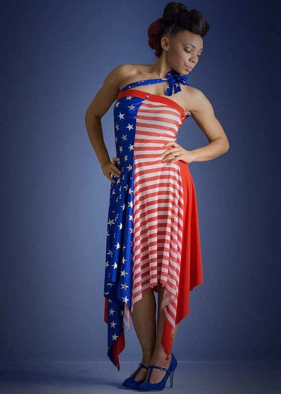 1 red, white, and blue Convertible Dress with 4 fasteners at the hemline, and a red 2” elastic band with 7 jeweled accents.