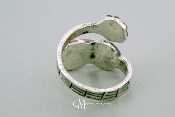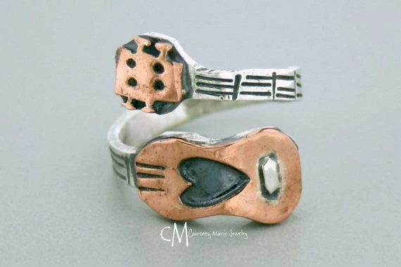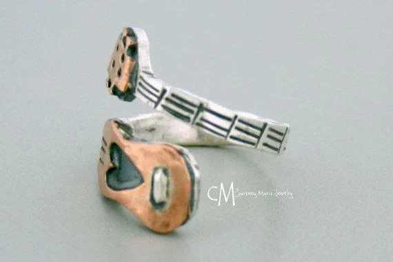 DESCRIPTION: This adjustable guitar ring is made of hand fabricated sterling silver and copper. The neck of the guitar wraps around the finger making it an adjustable piece, made to start at your preferred size. The base of the guitar is hand cut and stamped from 16 gauge sterling silver and an 18 gauge layer of copper has been soldered to the piece to act as the head and the body of the guitar.