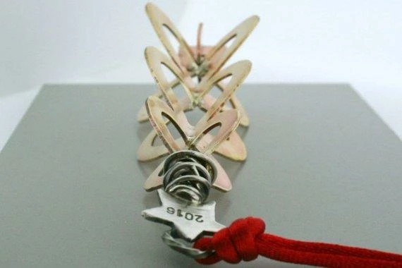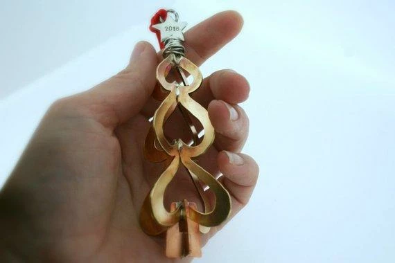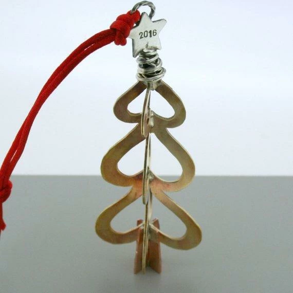 Unbelievably unique, this mixed metal Christmas Tree Ornament is entirely hand cut and it created from brass (branches), copper(trunk) and sterling silver (star). The year is stamped on the top and names can be added on the branches (up to 24 places to add names). Make this your family tree ornament for the year, it will surely be treasured for generations to come.
