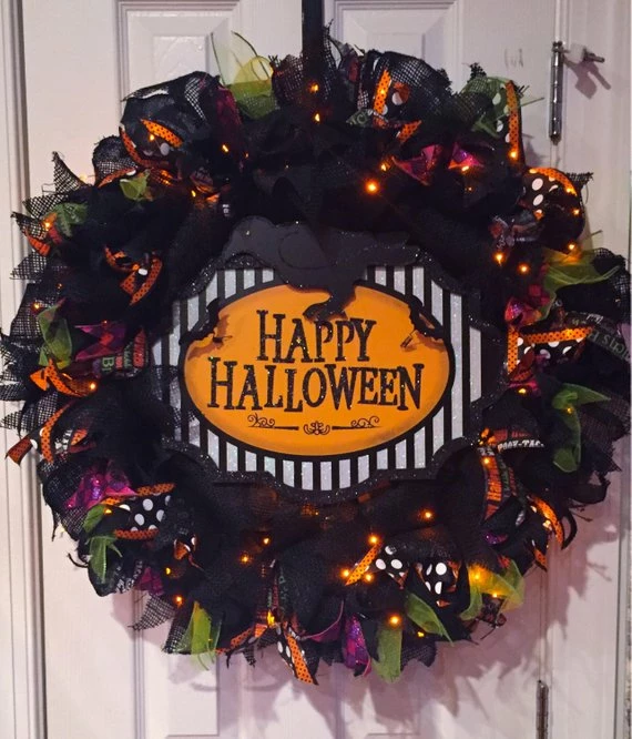 Halloween black green purple and orange burlap ribbon wreath. Measures approximately 25″ in diameter. Fits between storm door and front doors too! Beautifully hand made and designed with black burlap, black, green, purple and orange wired ribbon accents placed carefully. Includes two strands of battery operated led orange lights. Packed full of Festive ribbons for this Halloween wreath!