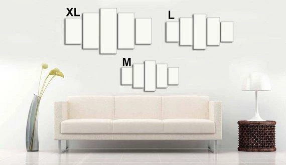 This canvas comes in either 1 panel or 5 panel style. Each style will have either Medium (M), Large (L), or Extra Large (XL) sizes.
