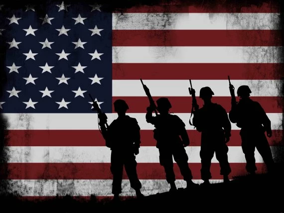 American flag featuring army rangers, navy seals, army national guard, US Marines and the US Military.