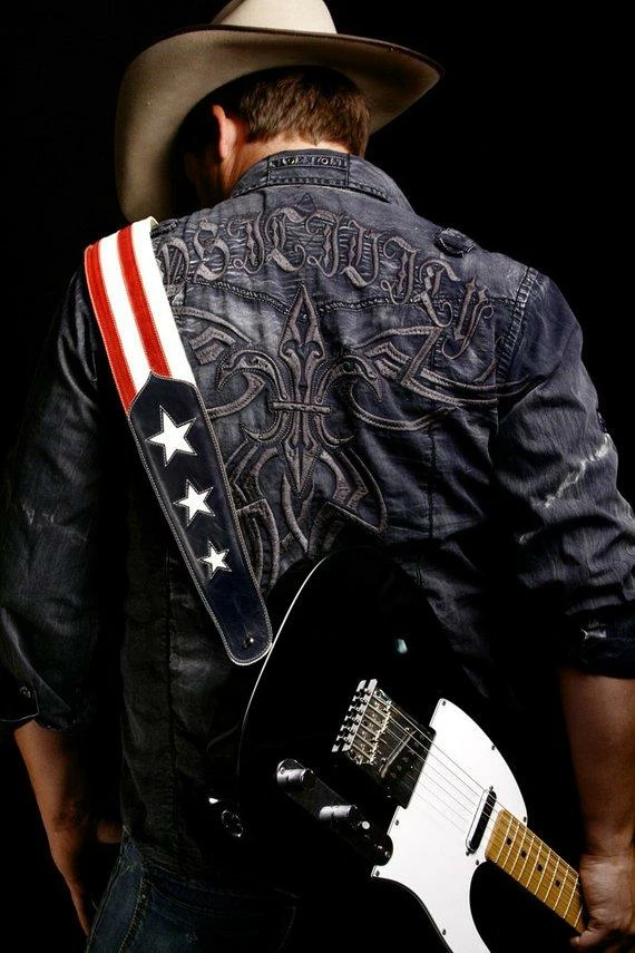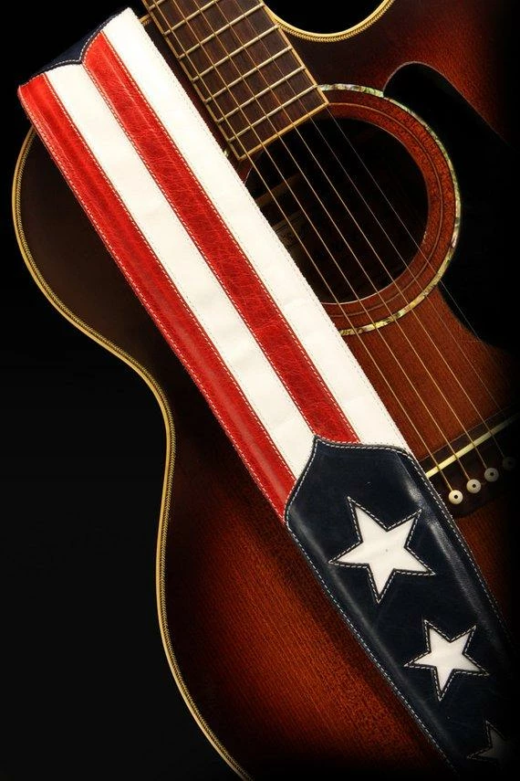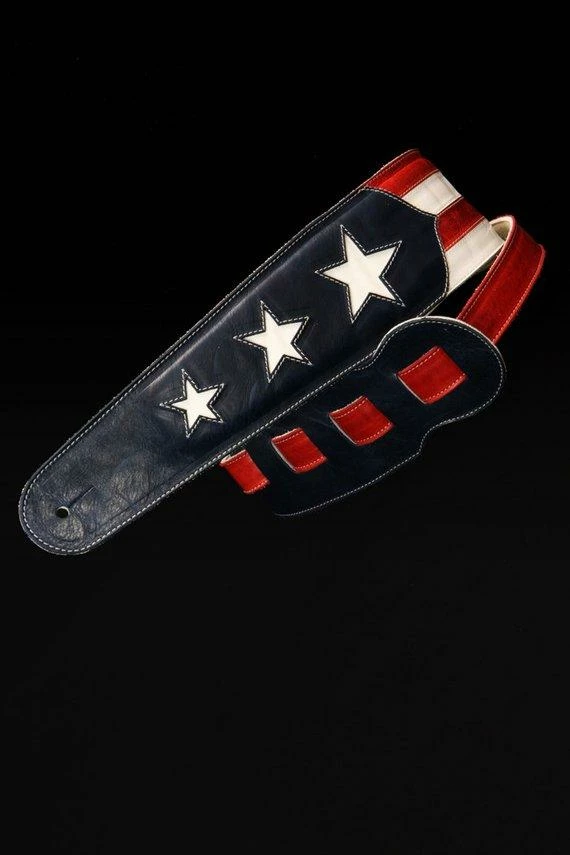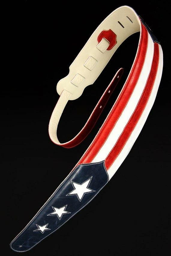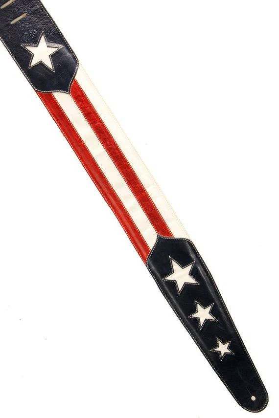 Ethos is proud to introduce the Flag Series of premium guitar straps. With several countries and flags on the design desk, it was not hard choosing which strap would be the flagship strap in this series. Old Glory pays homage to most recognizable symbol of freedom in the world, the American Flag. The history and legend of this flag inspired designer Chad Little as he chose the layout of the famous stars and stripes. Using Ethos’ trademark method of “Inlay-onlay” technique, the stripes , along with 3 ascending stars on each end, highlight the rugged, matte finished red, white and blue leathers. With the “Old Gory” guitar strap from Ethos, music and freedom have never had a more perfect union. Ethōs signature 3.18mm comfort-crafted padding is backed with a glove-soft, cream-cow lining for maximum player comfort.