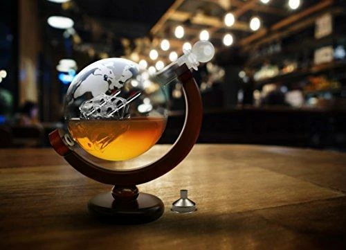 - ✔ COMPLETE WITH GLASS STOPPER AND POUR FUNNEL: World etched 28 Oz 850 ml globe decanter with a custom designed ship, wooden base, metal pour funnel and a glass stopper
