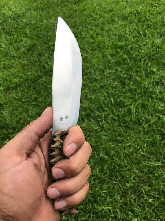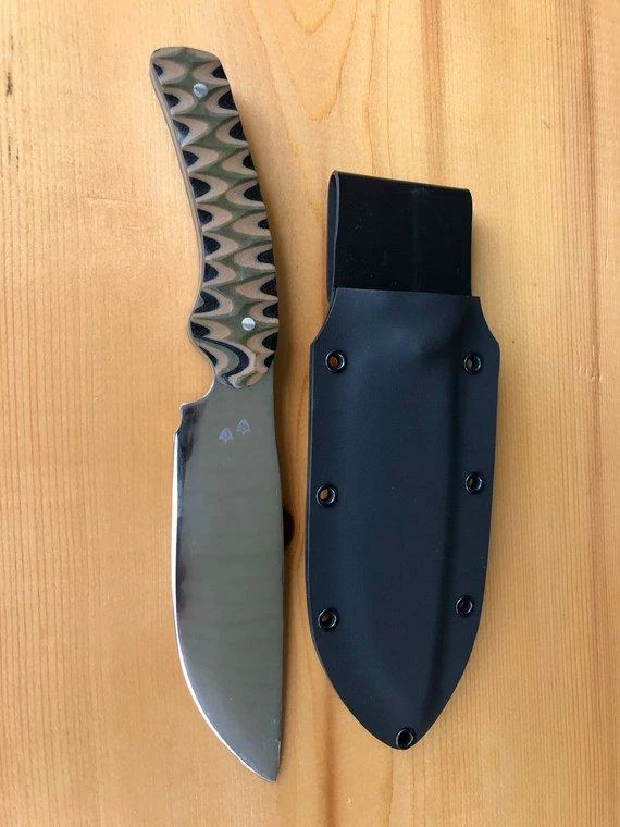 This knife is made from 0.125 thick D2 tool steel. The overall length of the knife is 9 inches; the handle is 4 inches long, the blade is 5 inches long by 1 5/8 wise. It was designed by me, and cut from D2 bar stock. It was heat hardened and tempered in a forge using a pyrometer to monitor temperature. The D2 steel is an air hardening steel, so air quenching was used in the hardening process. The blade is taken to a high shine for aesthetics. The handle is made of G10, and the kydex sheath was made by me as well.