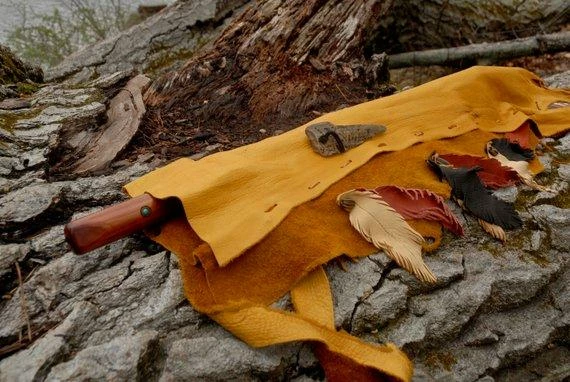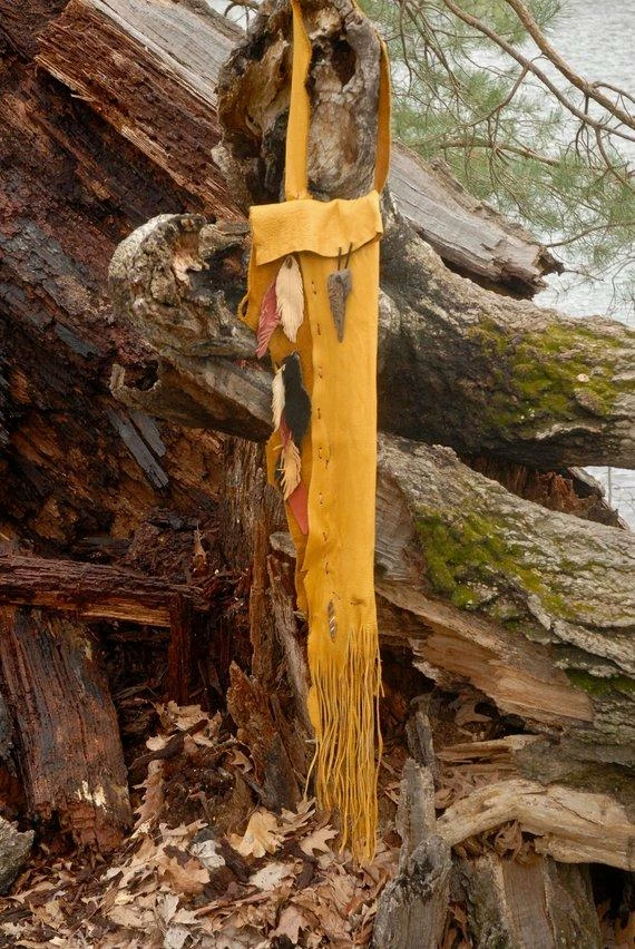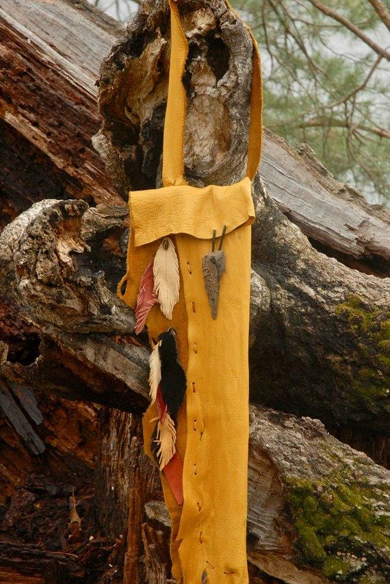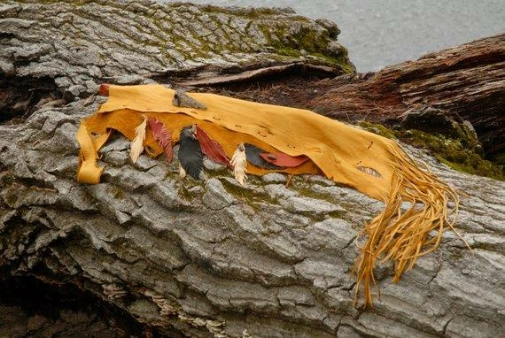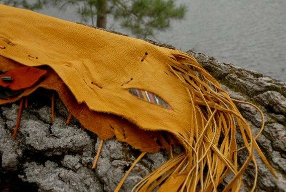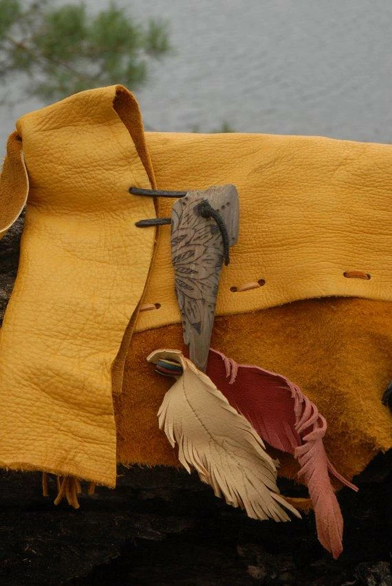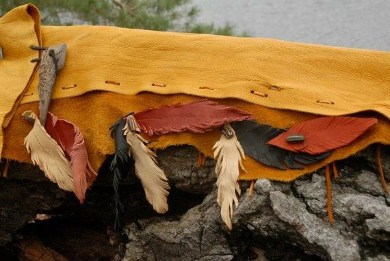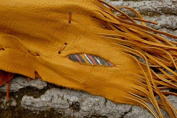 This listing is for a beautiful amber colored leather flute bag for a Native American styled flute. It has been lovingly made of a buttery soft leather Elk hide and there are leather feathers all down the side. Beautiful and velvety soft, with ties all along the edge. The fringe at the bottom is long and flowing. And you can always trim the fringe if it is too long for you. The closure is a loop that fits around a piece of driftwood. The driftwood is burned on both sides with a flower.
