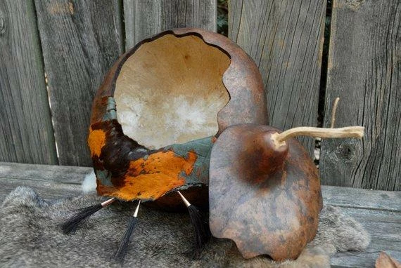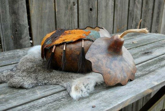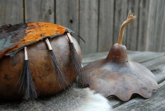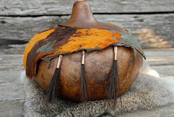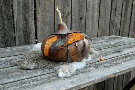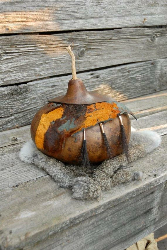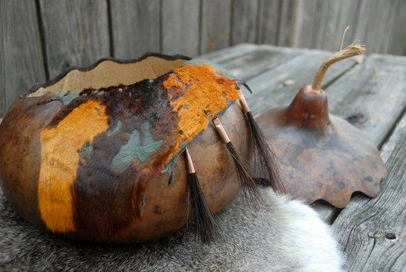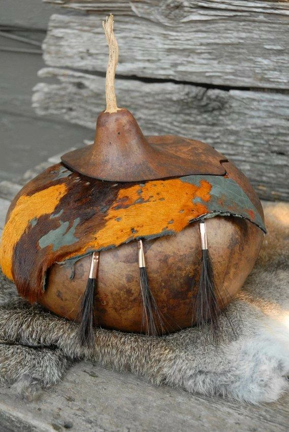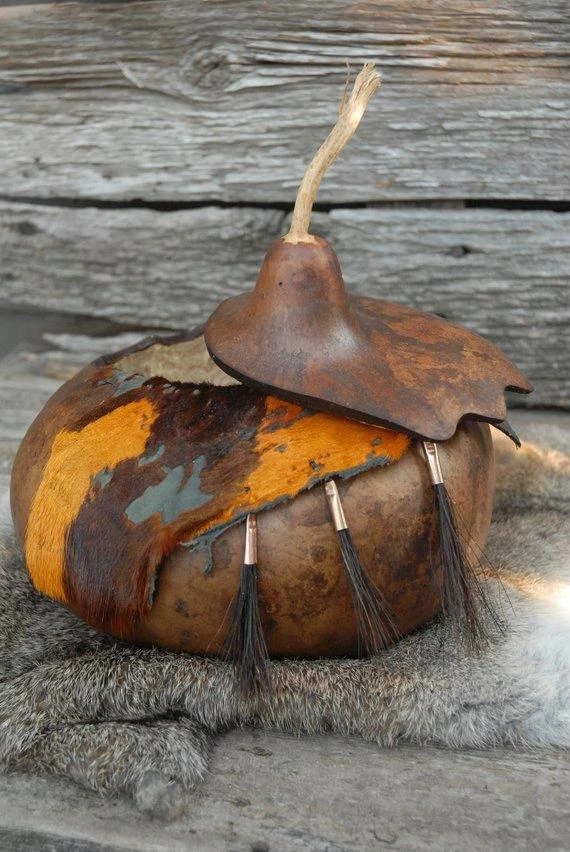 This listing is for a beautiful lidded gourd bowl. The colors are rich like the Autumn leaves. The gourd is scalloped on the back side and is pretty just as it is but the front with the hair on hide leather added to the rim really sets it off. Attached to the leather are three tufts of horse hair in copper cones. Again – the colors just take off with the touch of copper and with the hair on hide and the copper and horse hair the texture is off the meter!