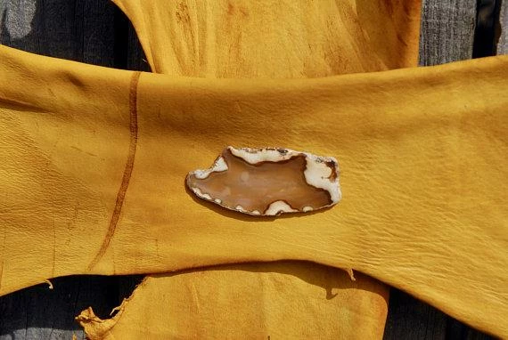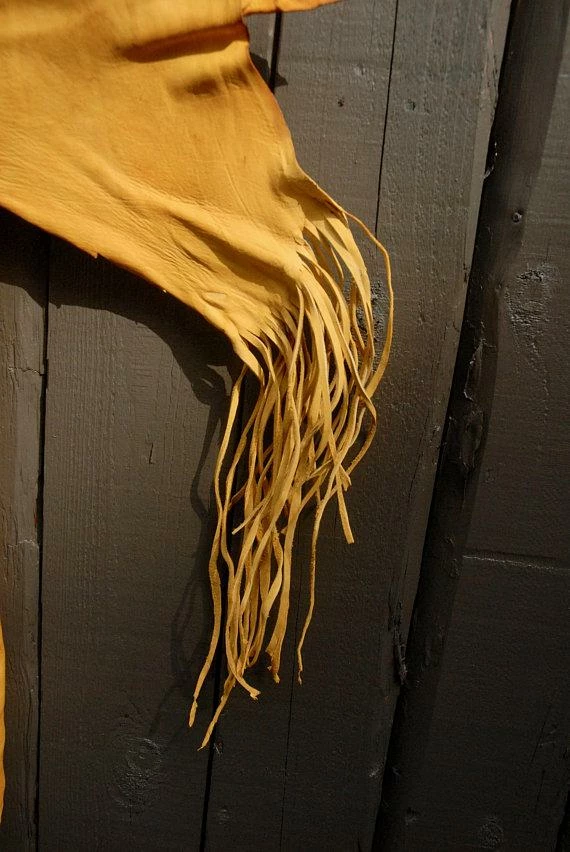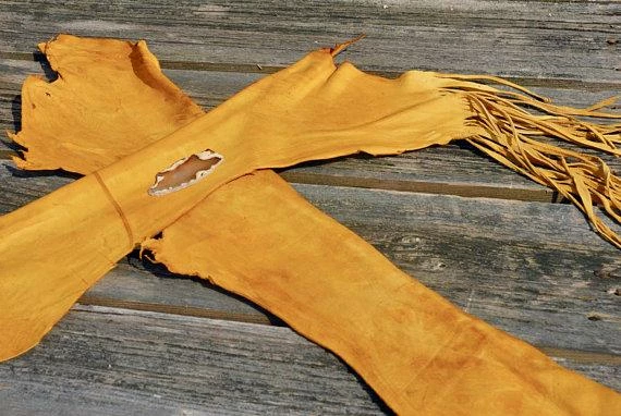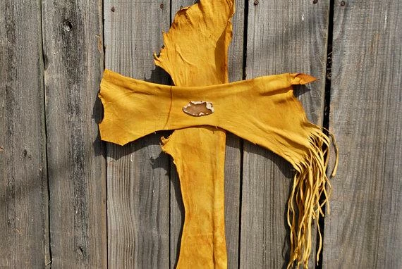 This listing is for a large yellow deerskin wall cross. This is a perfect cross for your rustic setting. A hint of the West and some Native influence come together very well here. Mother Nature plays a part in this as well with the sun doing the drying and highlighting the color. There is fringe hanging on one of the sides and an agate slice as a centerpiece.
