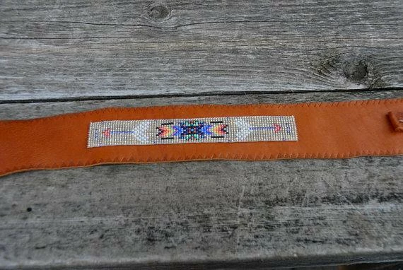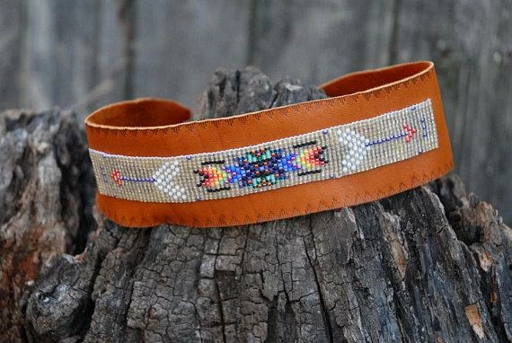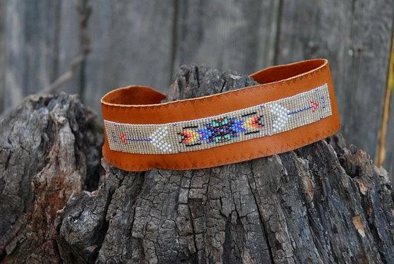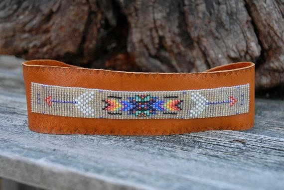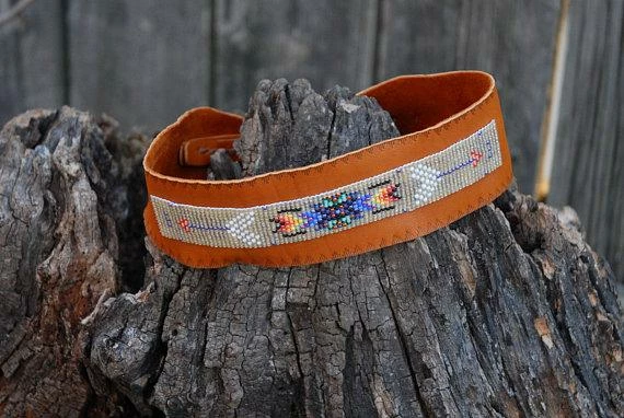 Secondly is the leather that the beadwork is attached to. It is such a privilege to work with beadwork such as this. I have mounted this to a rust colored leather. The leather is super soft. There is a tribal design branded into the leather around the edges. There is a great closure on this as well, just loop the leather through both rings, then go back through one ring. The rings grasp the leather so that it doesn’t slip or stretch over a long period of time. No danger of it coming loose either.
