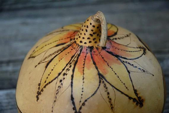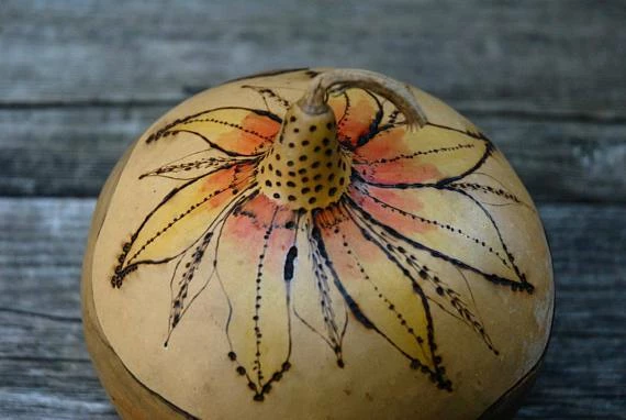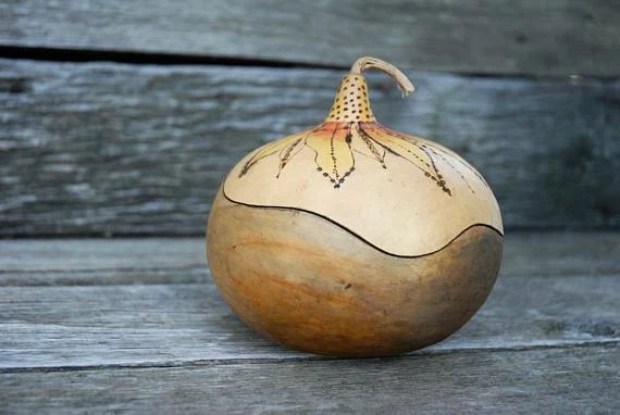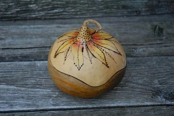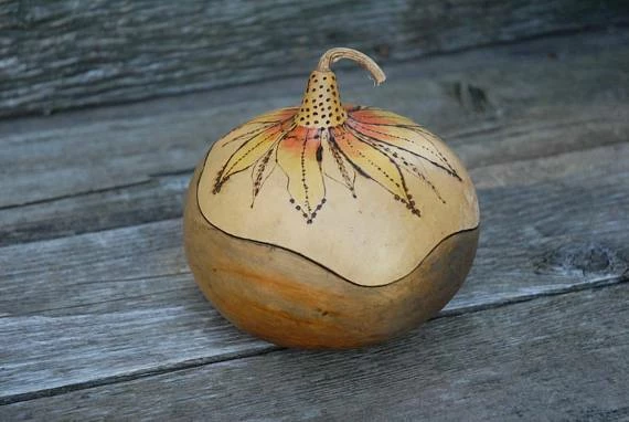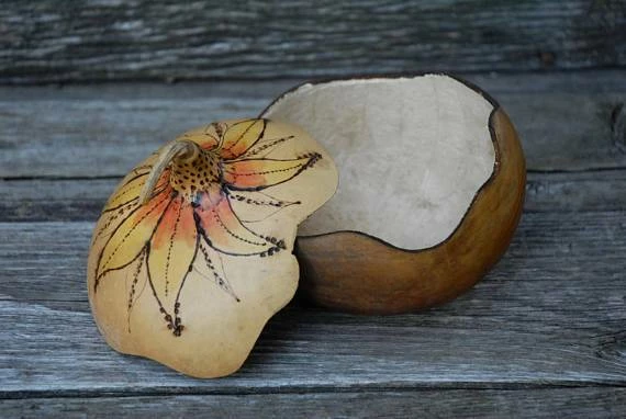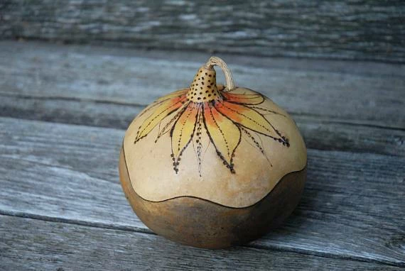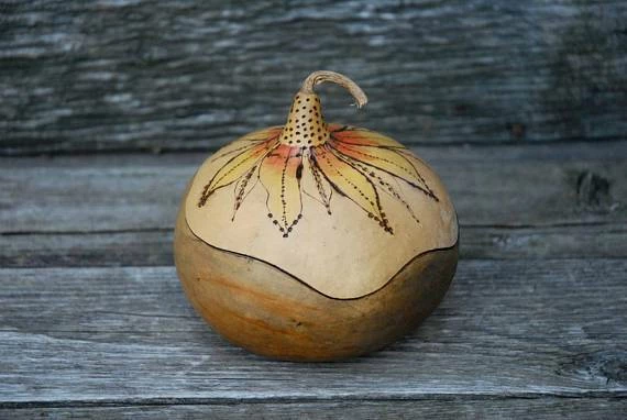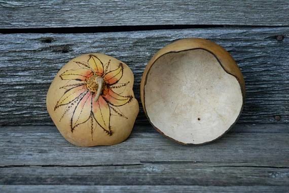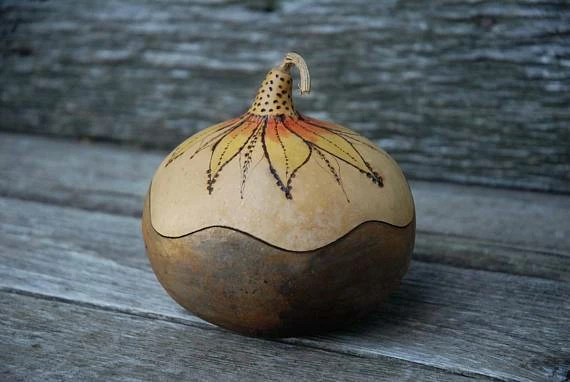 Oh so fun! Say hello to this little sunflower gourd dish. It has a sunflower burned into the top lid and it is highlighted with dye to add a touch of yellow and orange of the beautiful sunflower. The bottom of the gourd has a orangish brown. It is unfinished in the inside.