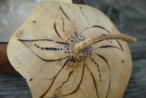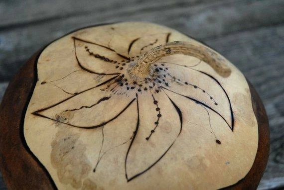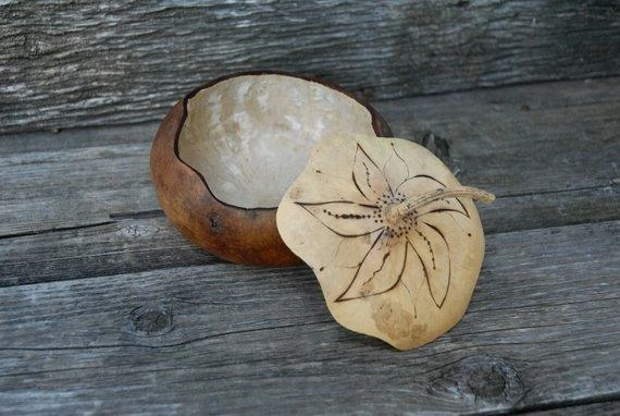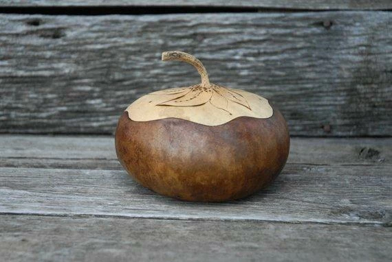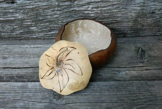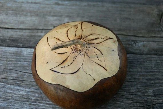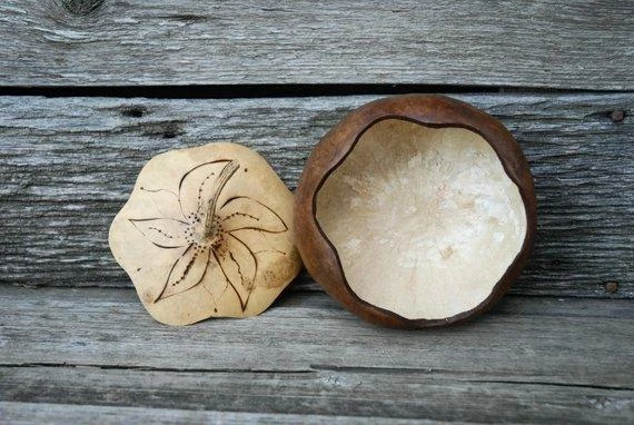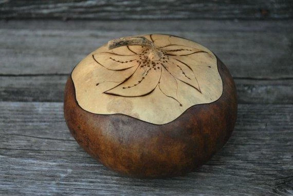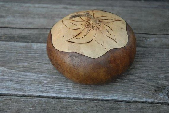 Oh so fun! Say hello to this little sunflower gourd dish. It has a sunflower burned into the top lid.
