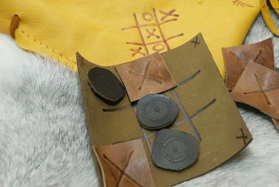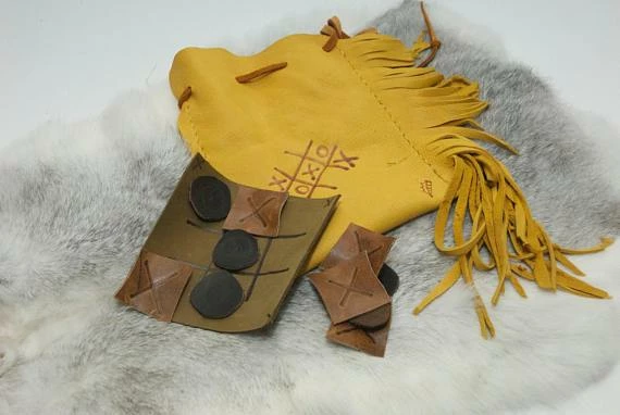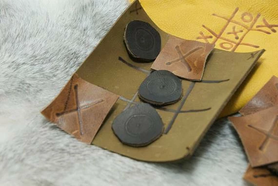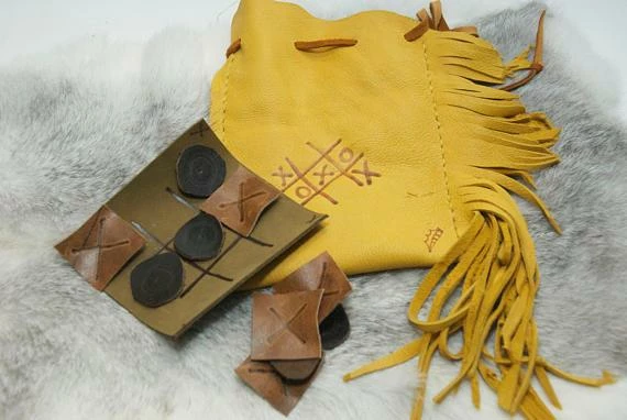 The tic tac toe board is made out of pigskin and the play pieces are made out of different kinds of leathers and branded with the x’s and o’s. 5 playing pieces of each.