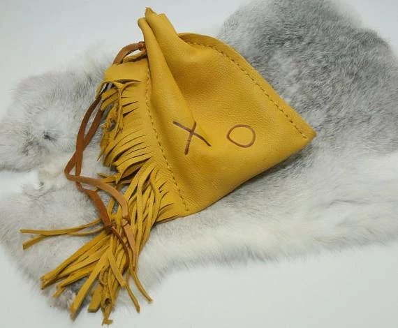 The bag is made out of the softest deerskin with a deerskin strap serving as the drawstring. Handstitched and branded with love and fun in my heart!
