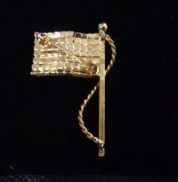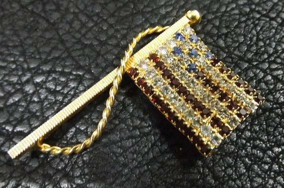 Vintage Americana! Patriotic flag brooch or pin featuring loads of red, white and blue rhinestones. All rhinestones are prong set and intact; no missing stones. All rhinestones are sparkling; no dead stones. Flag is not flat; it has a little “wave” to it which makes the rhinestones catch more light. The flag even has a rope. Very nice design. Quality piece. Clasp in good working order. Brooch measures 2″ x 1-1/4″.