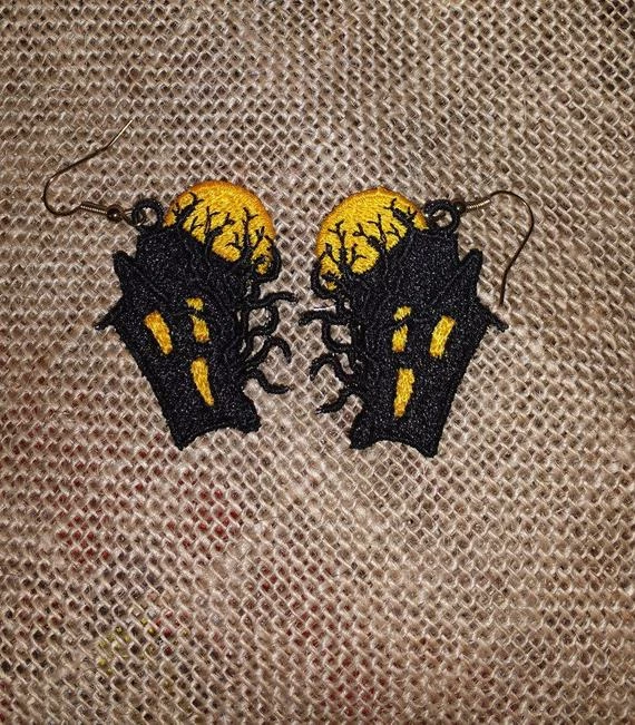 A pair of FSL (free standing lace) embroidered Haunted House earrings. So cute for beggars night or to finish off a Halloween costume. Brand new, never used.