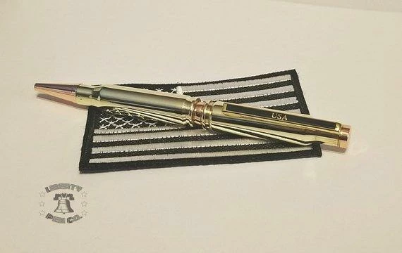 THE PROUD! Double bullet brass .308 casings! The accents on this pen are polished copper with a unique USA engraved pocket clip! Pens comes in a locking rifle case (black, desert tan or olive drab) and as always comes with an extra refill and that beautiful American flag patch!