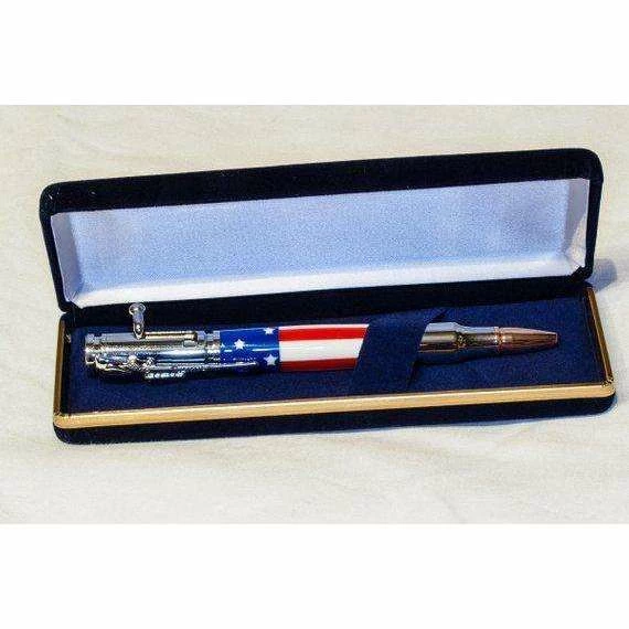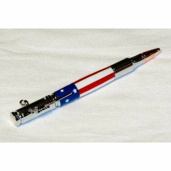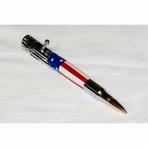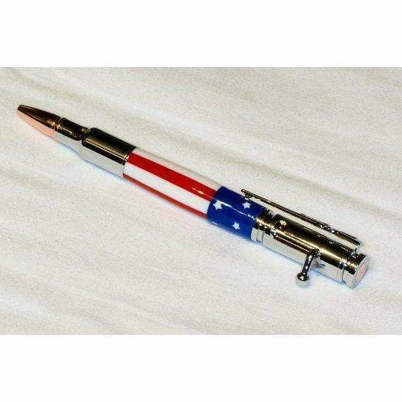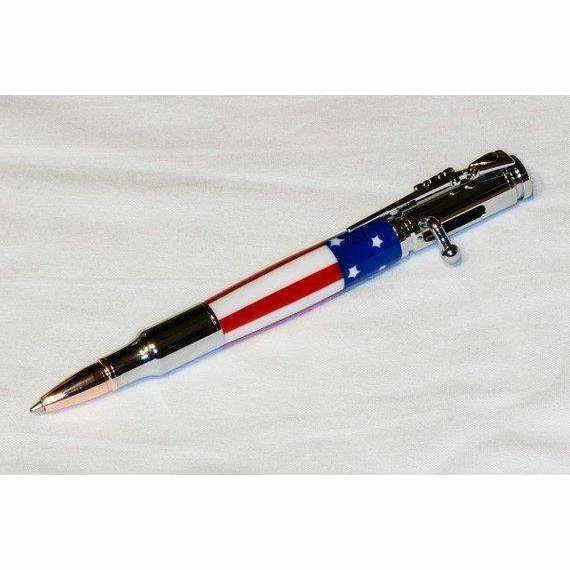This is a handmade Bolt Action “stars and stripes” pen. Turned on a lathe from stars and stripes acrylic, the body of this pen nicely complements the chrome plating on the hardware.