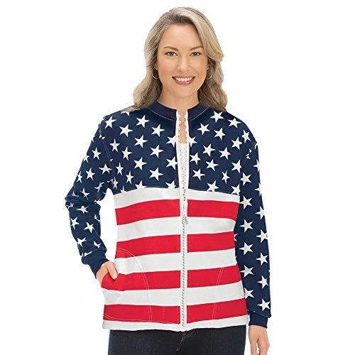 This festive jacket features a patriotic print with stars at the top plus red & white stripes on the bottom. It has long sleeves, two front pockets and a full zippered front that’s accented with sparkling crystal accents. Machine wash. Cotton and polyester; imported. Approx. 26″L. Sizes available in Misses M(10-12) or L(14) and Womens XL(16-18) or XXL(20-22).