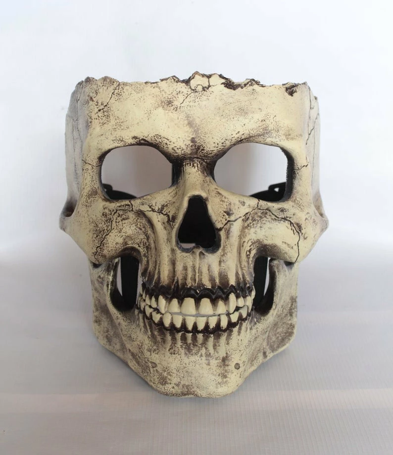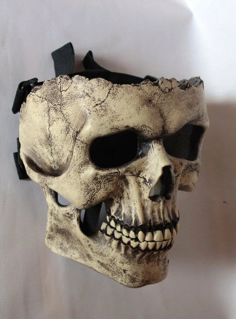 Depending on the shape and size of the head, the mask sits in different ways. This is a half mask, it does not have an upper part covering the crown. If the head size is not suitable, there is a risk that the mask will slide down when trying to open the jaw. If you are not sure and do not want to take risks, I can put an additional mount in the middle of the mask that will extend vertically from the point between the eyes to the back of the head. If such a fastening is necessary, inform about it in the comment to the order.