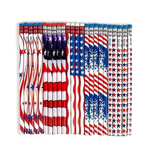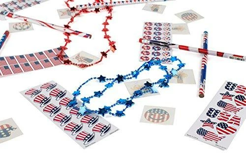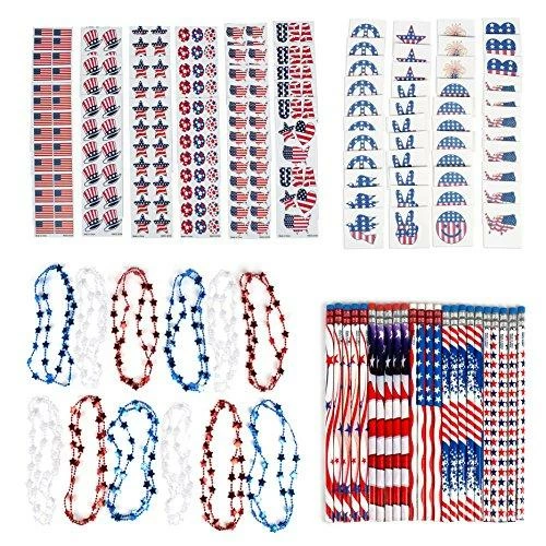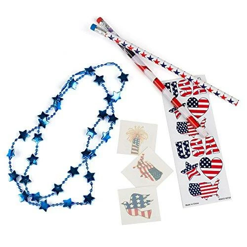 INCLUDES: 72 Patriotic Tattoos with American Flag Designs, 24 Assorted 24 Fourth of July Theme Sticker Sheets, 24 Independence Day Star Beads Necklaces in Red, White and Blue true American coloring, and 24 4th of July Themed Pencils.