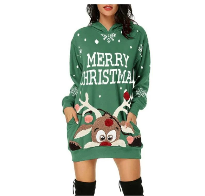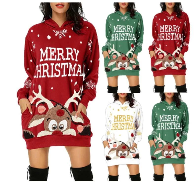 NORA TWIPS Official Store Christmas Women Clothing Christmas Dress Women Fashion Christmas Hoodie Bag Hip Pocket Print Hoodie Dress Long Sleeve Winter