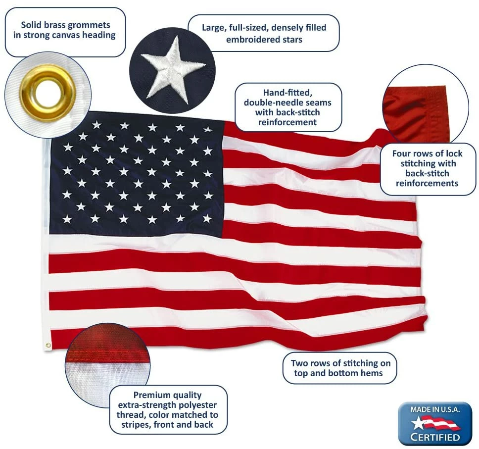 - Expert Craftsmanship! SEWN stripes use double-needle LOCKSTITCH with 4 ROWS on the Fly Hem and Back Tack reinforcement. Vivid WHITE STARS are densely EMBROIDERED. Brass Grommets.