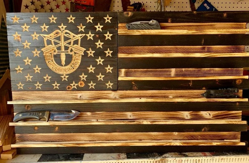 You may now conceal not just your tactical gear, but also a unique way to show off your knife collection. The flag is created, burned, and each white stripe features a one-of-a-kind knife holder strip that allows you to lay your blades horizontally. The star in star pattern creates a genuinely one-of-a-kind aesthetic, with no two pieces alike. The dimensions of this sculpture are 33″ x 19″ x 4″. The 13″ x 9″ internal compartment has enough room to store your favorite tools inside the 2.25″ Kaizen foam included. A magnetic lock is included to maintain security while allowing for quick and easy access. To be entirely ready, add the “Red Light” motion sensor light option ($10). Are you all set? Place your order now! Color, burnt, thin blue line, thin red line, and thin green line are all available.