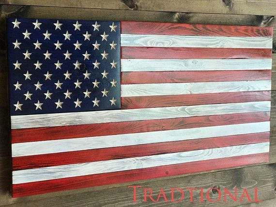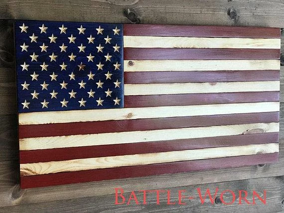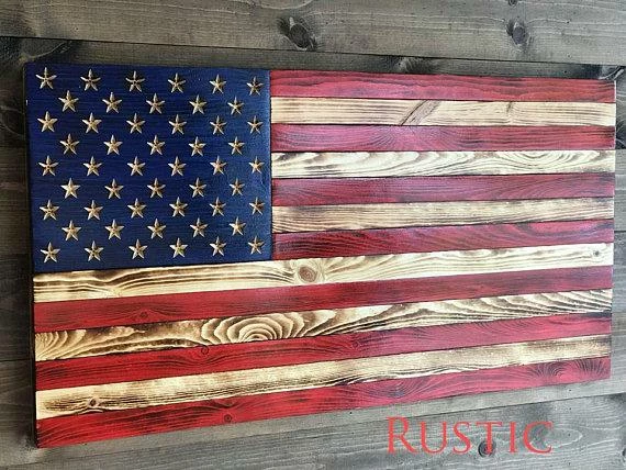 -These Flags have a cool rustic feel. They have stained Red Stripes and lightly burned natural wood stripes with a Blue Union(Part with stars). The burn on this style can be adjusted to Light, Medium or Heavy!