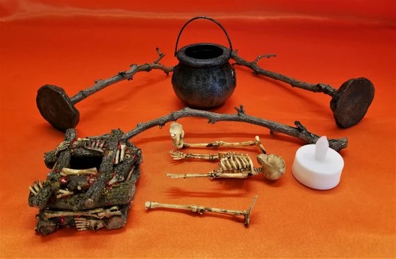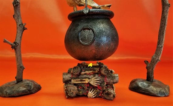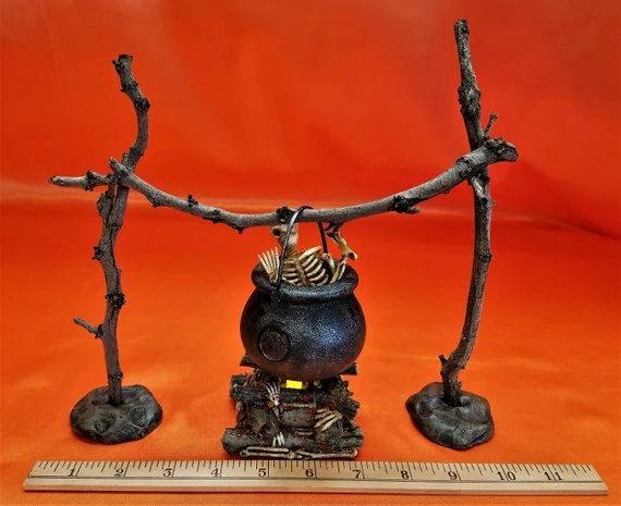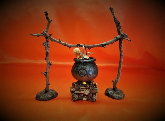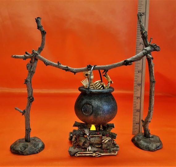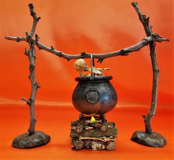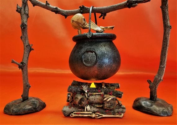 Handmade Witch’s Cauldron Cooking a Skeleton over a Burning Witch Fire