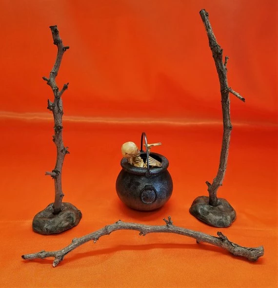 Starting with the cauldron. This is a black 3″ plastic cauldron that I’ve given a ‘well-used’ patina so it looks like real cast iron and that it’s been over the fire many times. Inside, a full skeleton has been ‘sectioned’ to fit into the pot (eeewwww). The cauldron is suspended on a real wood (black locust) cooking tripod that consists of two 9″ support poles and one 9″ (removable) cross pole. The cross pole sits naturally on small side branches on the support poles. The support poles are set into ‘boulders’ of hand-painted clay.