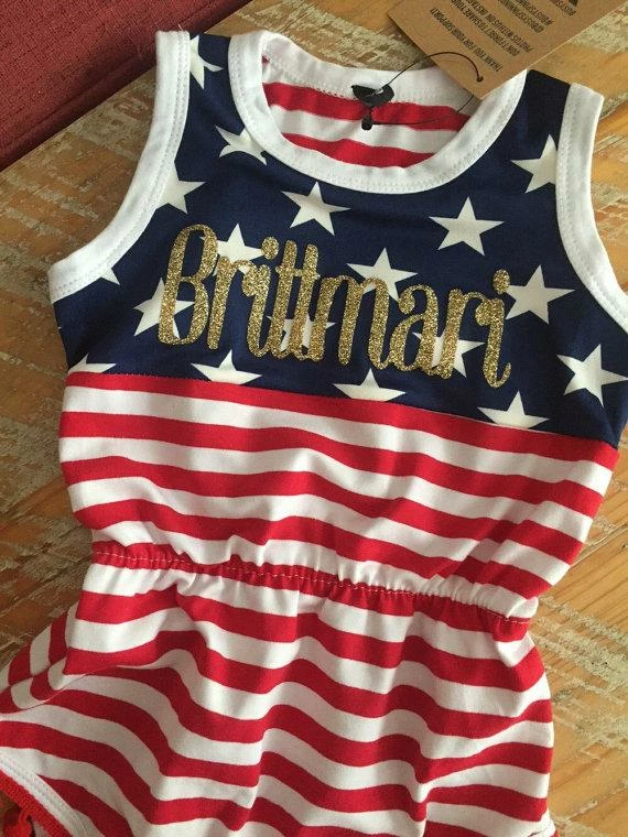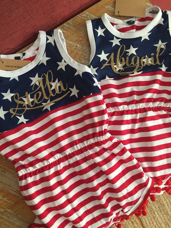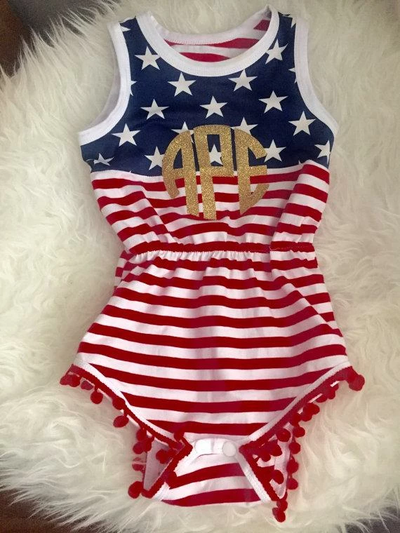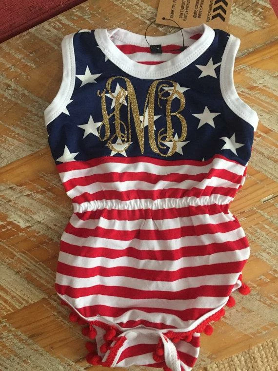 The cutest monogrammed baby romper for your July 4th event! And so cute to wear year ’round because America is always in style.. Hurry!! Limited availability!