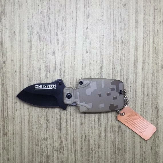 Camo printed handle with american flag tag made with genuine leather. High quality, heavy and solid. Built well and tight. Great military gift or groomsmen gift. Also great for the father of the bride! 4.5″ overall length, black blade, spring assisted with belt clip, canteen shaped. Shipped in a gift box with the picture of the American flag and Pledge of Allegiance on the lid.