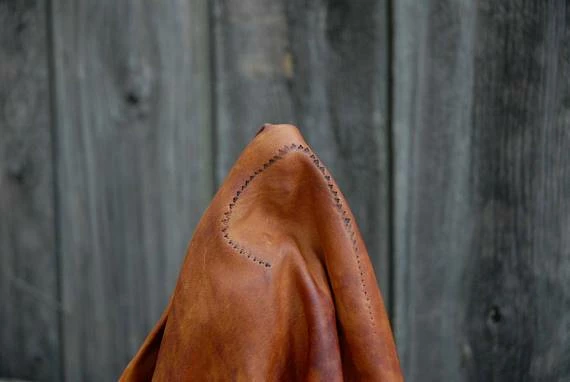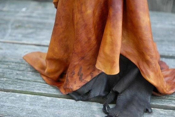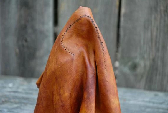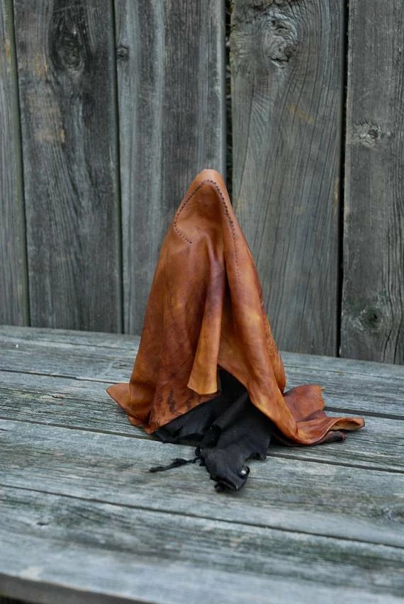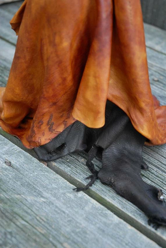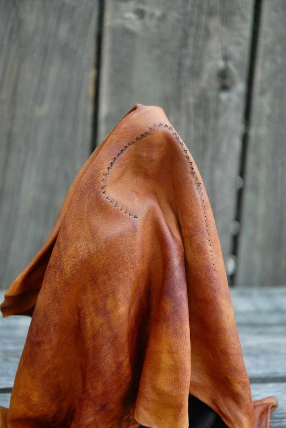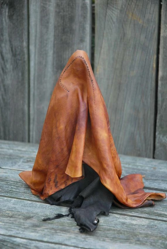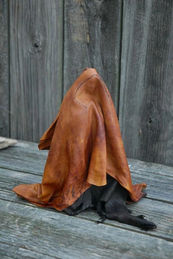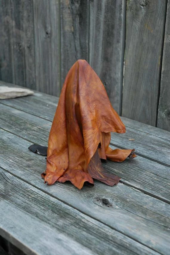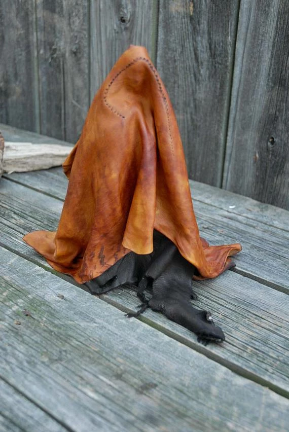 She is made out of saddle deerskin and has a chocolate deerskin under her robe at the bottom. She stands 9 1/2″ tall. Her torso is about 10″ wide by 7″ deep from front to back. She is very lightweight and very stable. I have branded an edge around her face.