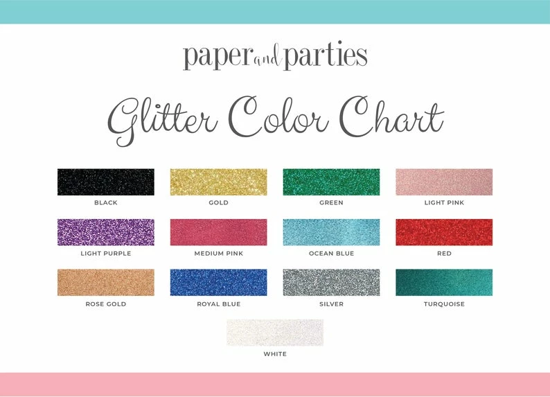 | Primary colour | Gold Glitter, Silver Glitter, Black Glitter, Rosegold Glitter, White Glitter, Light Pink Glitter, Light Blue Glitter, Light Purple Glitter, Turquoise Glitter, Red Glitter, Green Glitter, Royal Blue Glitter |