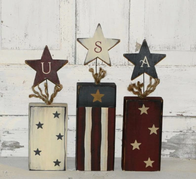 I have designed this set of primitive wood firecrackers to make a nice shelf sitter grouping for your primitive Americana patriotic home dΓ©cor. I have painted them in burgundy, ivory and adriatic blue with accents of a vertical flag and assorted stars. At the top I have added jute with painted stars with the letters USA. These will look nice on mantels, shelves, buffets, tables and counters. Back will be stained. Tallest one will be 13-13.5″ high and all will be 3.5″ wide.
