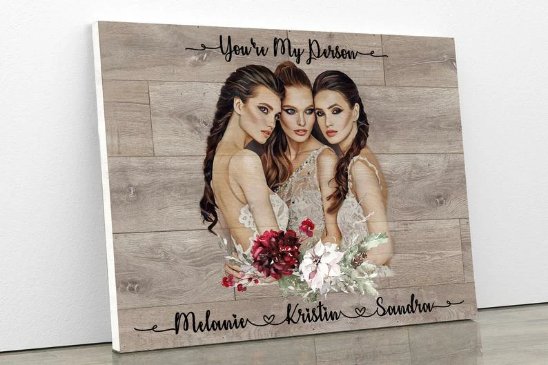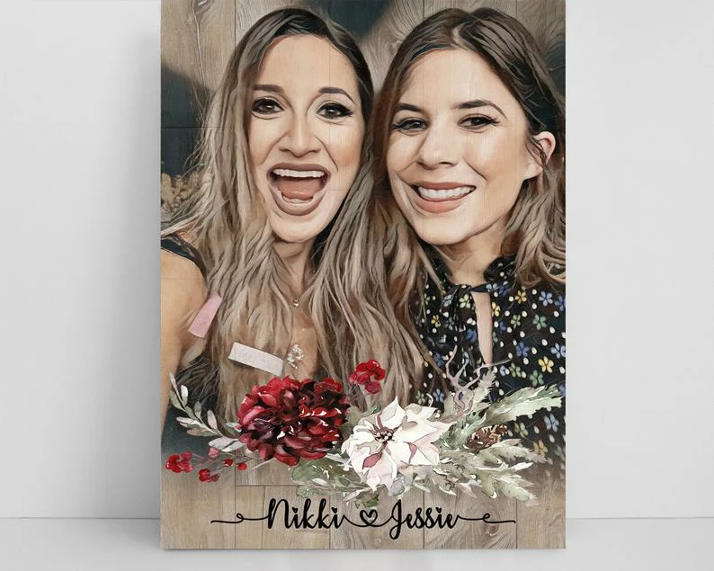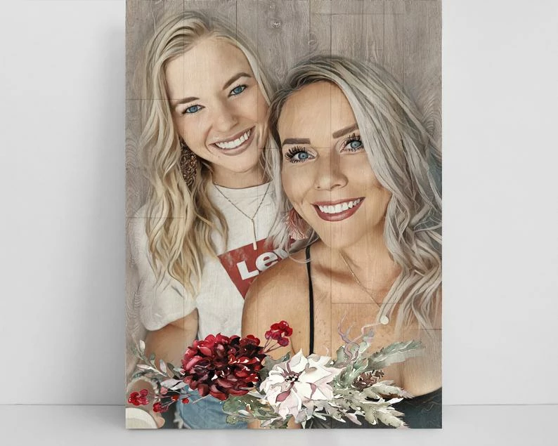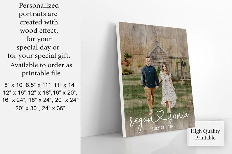 Printable digital file personalized portraits are created with wood effect, for your special day or for your special gift