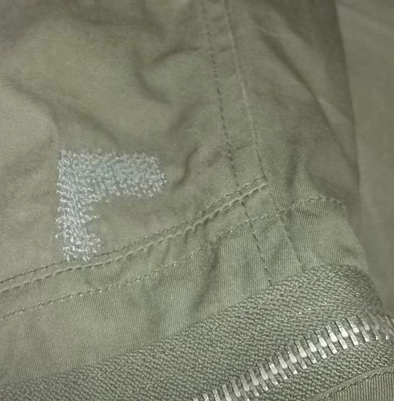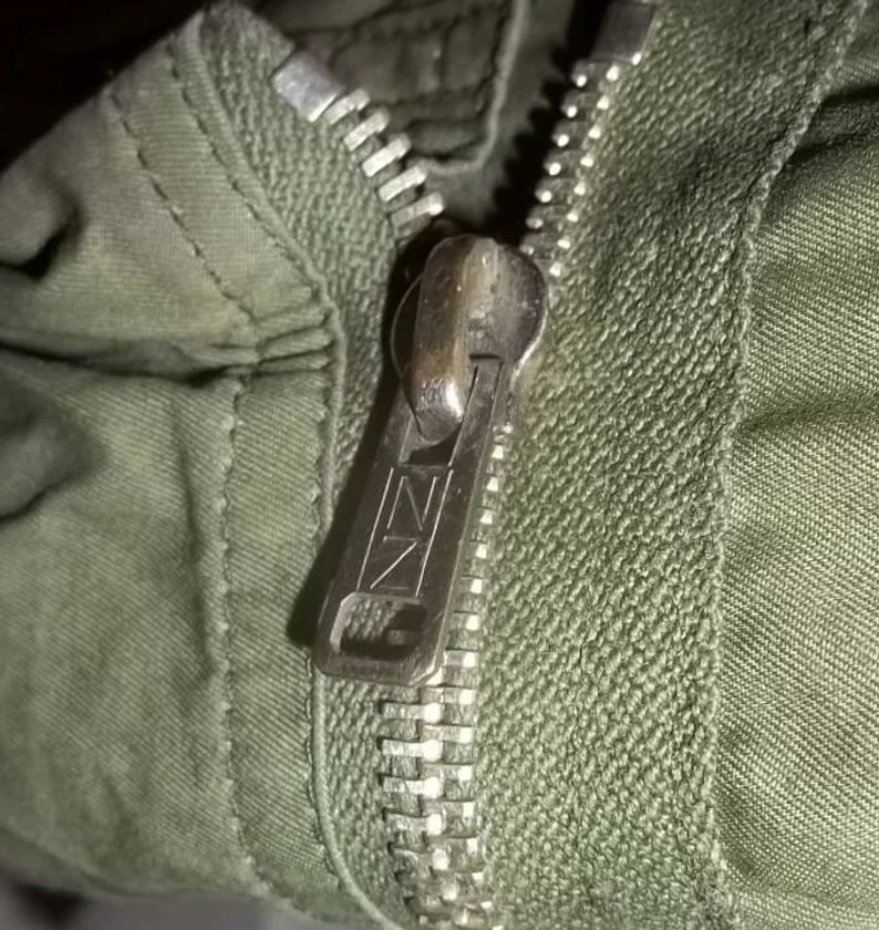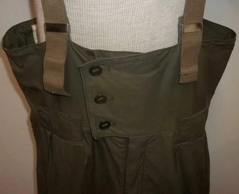 The trousers are moderately (not excessively) worn, good condition, no rips, no holes, with one professional repair to the outside layer of the left knee, as shown on detail photo. The original brass GENERAL zippers work fine. All original buttons are there. The white cotton pocket bags are clean, suggesting little use of the trousers. Clean, no stains, no odors, readily wearable, highly presentable.