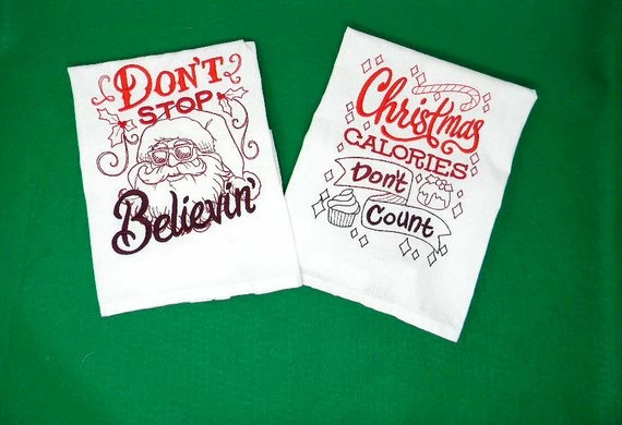 Pretty towels to bring the Christmas spirit to your kitchen. These towels are 100% cotton and the design is machine embroidered.