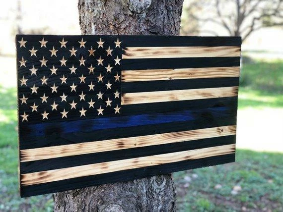 This Beutiful rustic wooden American flag with the thin blue line that represents our law enforcement heroes is hand made here in upstate New York. All stripes are made of individual pieces of wood and the stars are all carved into the wood. The flags are stained and torched to give it the beautiful rustic look and no two flags are the same!