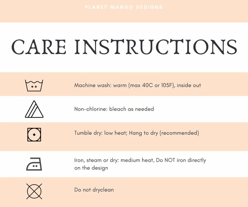 -Do NOT bleach – Do NOT Use Fabric Softener – Do not dry-clean – Do NOT iron directly on the design