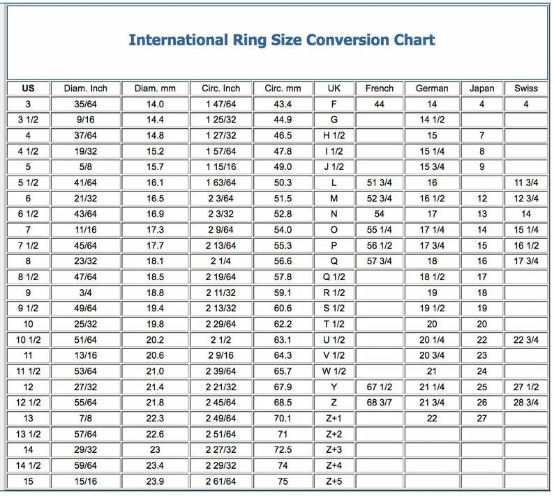 | Woman's Ring Size | 4mm band- 5 US, 4mm band- 5.5 US, 4mm band- 6 US, 4mm band- 6.5 US, 4mm band- 7 US |