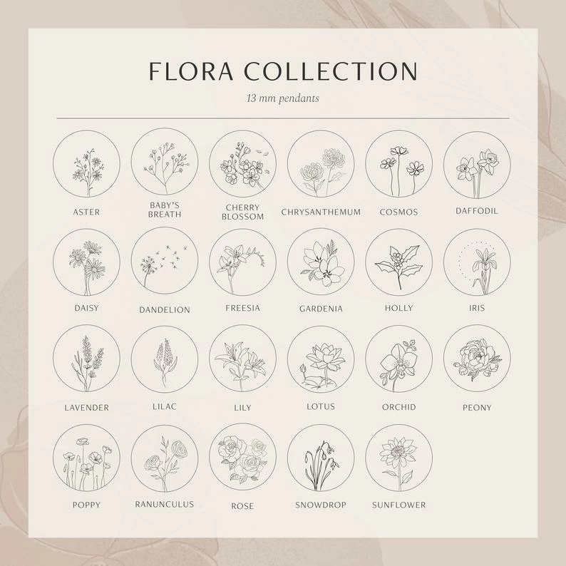 | Flower | Aster, Cherry Blossom, Chrysanthemum, Cosmos, Daisy, Daffodil, Dandelion Puff, Freesia, Gardenia, Holly, Iris, Lilac, lily, Lotus, Orchid, Peony, Poppy, Rose, Snowdrop, Sunflower, Baby's Breath, Lavender, Ranunculus |