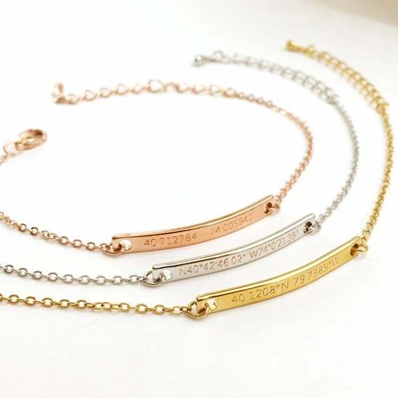 This custom engraved bracelet has a delicate pendant engraved with the coordinates of your choice. Order two and have a pair of customized couple bracelets, perfect for any occasion! These latitude longitude bracelets are perfect for commemorating any location that is meaningful to you. There is no better treasure than one with personal meaning.