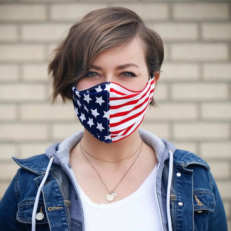 A patriotic fashion statement for your new day attire. A cotton (non-steryl) face mask. Washable. Lined with cotton. Elastic loops around the ear.