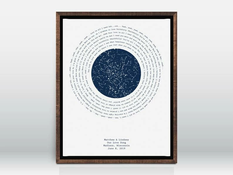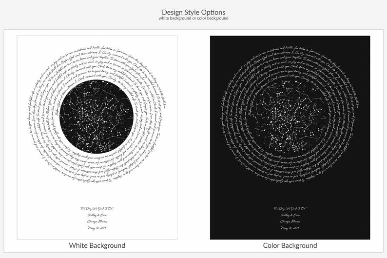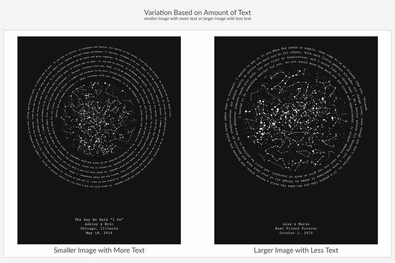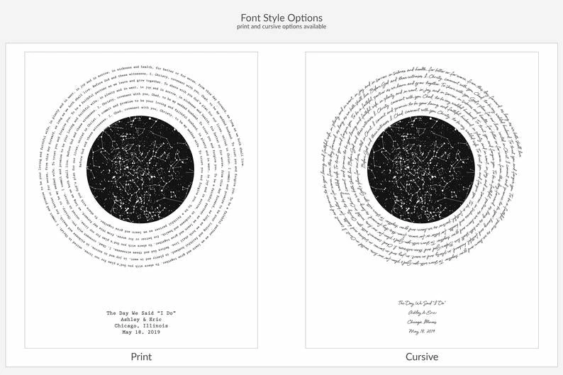 → This design features a unique night sky from a specific date and location and personalized text.
