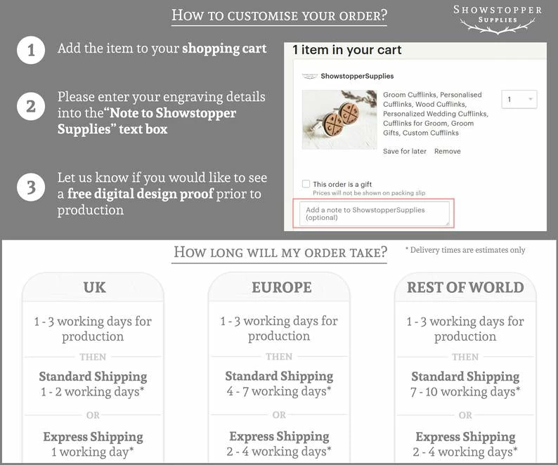 * FREE DESIGN PROOF – Design proofs are available prior to engraving, just leave a message requesting this when placing your order.